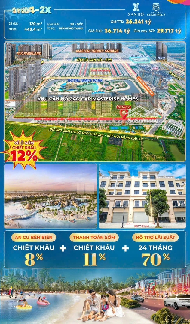 SH24 Siêu phẩm SHOP VIP kim cương - Trung tâm thương phố bên thềm chung cư 2 mặt tiền, 448m2 xây dựng, 120m2 đất vàng - tạo nên không gian thương mại vững chãi và linh hoạt, vừa đủ công năng để kinh doanh đỉnh cao, vừa đủ bề thế để kiến tạo văn phòng đại diện chuẩn quốc tế. Vị trí không thể thay thế: Mặt tiền ôm trọn trục chính San Hô 24 - điểm kết nối huyết mạch dẫn thẳng ra vành đai 3.5, cánh cửa giao thương mở rộng không giới hạn. Đối diện 7 tòa chung cư Masterise Homes cao cấp - bảo chứng dòng khách, dòng doanh thu và tỷ lệ lấp đầy vững chắc. Phía sau là công viên xanh mát - một không gian xanh hài hoà giữa trung tâm thương mại sôi động. 2 mặt thoàng đón nắng tự nhiên, đảm bảo năng lượng vượng khí và cảm hứng thịnh vượng xuyên suốt 4 mùa. SH24- Nơi tương lai lợi nhuận đã được định sẵn. Mỗi nhịp tiến độ của dự án chung cư đối diện là một nấc thang mới của giá trị tài sản, nơi giá bán không chỉ tăng, mà địa vị của gia chủ cũng được nâng tầm. Đầu tư không cần đợi tương lai, vì tiềm năng đã hiện rõ trước mắt. Liên hệ ngay để trở thành chủ nhân siêu phẩm tinh hoa hữu hạn SH24-SIÊU SHOPHOUSE - VUA DÒNG TIỀN!Đặc điểm nổi bậtDiện tích :120m2Mặt tiền :6mGiá :26,24 tỷSố tầng :5 tầngĐường vào :20m