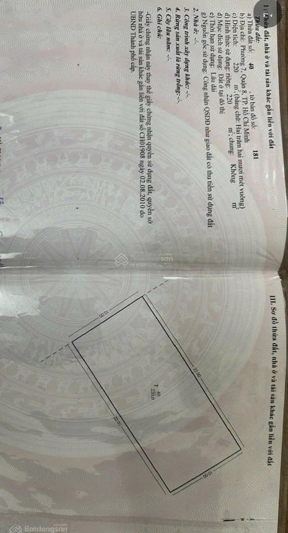 Nằm ở Phú Lợi, Đường Phạm Thế Hiển, Quận 8, TP.HCM, lô đất nền này có diện tích 220m2 và giá chỉ 11,3 tỷ VND. Pháp lý đầy đủ, đảm bảo an tâm cho mọi giao dịch. Mặt tiền rộng 10m, đường vào 20m, siêu dễ dàng cho xe cộ ra vào. Phong thủy tốt, cửa chính hướng Tây Nam, mang lại vượng khí cho gia chủ. Chỉ cần tưởng tượng thôi đã thấy sống ở đây cực chất rồi! Chi tiết dự án Dự án Phú Lợi do Khu dân cư Phú Lợi đầu tư, với thiết kế hiện đại và tiện ích nội khu cực kỳ phong phú. Có trung tâm thương mại, trường mẫu giáo, và trường cấp 1, 3 ngay trong khu. Ngoài ra, dự án còn kết nối thuận tiện tới Lotte Mart, Đại học quốc tế RMIT, Bệnh viện Quốc tế FV, Metro Bình Phú và Big C An Lạc. Liên hệ ngay để biết thêm chi tiết: Phương Đặc điểm nổi bậtDiện tích :220m2Mặt tiền :10mGiá :11,3 tỷĐường vào :20m