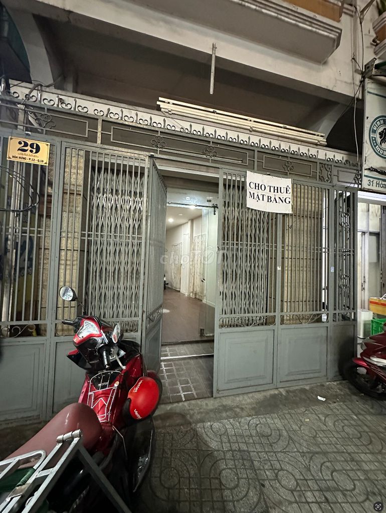 Cho thuê mặt bằng để mở văn phòng/kinh doanh 4x8m tại số nhà 29 Hòa Hưng, Quận 10. - Nhà MT rộng sạch đẹp. - Đầy đủ tiện nghi, có nhà WC, điện nước, đèn, quạt đầy đủ (có thể gắn thêm nếu cần thiết). - Có đồng hồ điện, nước riêng. - Có vỉa hè rộng, thoáng, thuận lợi trong việc để xe. - Giá cho thuê: 12.000.000đ/tháng (miễn qua trung gian). - Yêu cầu: Không ở lại qua đêm, không cho thuê bán ăn uống, cắt tóc, rửa xe... Ưu tiên làm văn phòng. Mọi chi tiết LH cô Ngọc Ánh (DĐ: *** hoặc có thể LH trực tiếp mọi lúc).