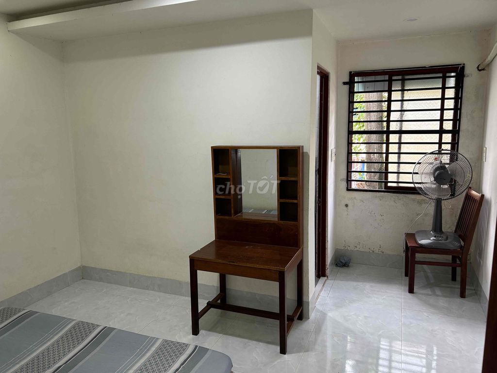 Mình có phòng nhỏ trên tầng 2 nhà nguyên căn. Phòng có sẵn nệm, quạt, cửa sổ hướng ra vườn thoáng mát. Nhà vệ sinh riêng có máy nước nóng như hình