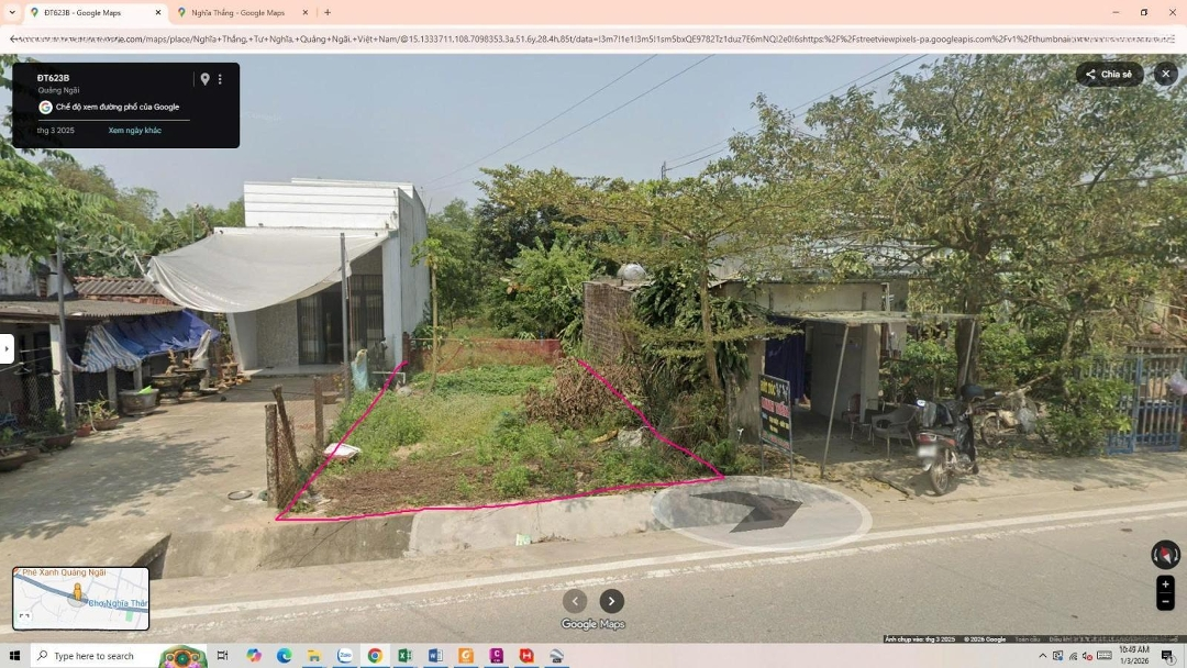* Bán đất thổ cư mặt tiền đường Tỉnh DT623B. - Sổ riêng, đang giữ, không tranh chấp, không thế chấp ngân hàng. - Diện tích 271,1 m2. Trong đó đất thổ cư 200 m2, đất nông nghiệp 71,1 m2. - Kích thước: Ngang 6 m, dài 46 m, hướng Nam mát mẻ. * Phù hợp kinh doanh, buôn bán, xây xưởng,... * Tiện ích: Mặt tiền là đường Tỉnh nên đi đâu cũng thuận lợi, sát bên trường học, trạm xá,... - Trường mầm non Nghĩa Thắng: 150 m. - Trường tiểu học Đông thắng: 900 m. - Trường THCS Nghĩa Thắng: 150 m. - Trường THPT số 2 Tư Nghĩa: 750 m. - Trạm y tế xã Nghĩa Thắng: 500 m. - Bưu điện xã Nghĩa Thắng: 350 m. - UBND xã Trà Giang (mới): 350 m. - Chợ Nghĩa Thắng: 650 m. * Cách nút giao Cao tốc Quảng Ngãi - Đà Nẵng 5 km. * Cách Khu công nghiệp Quảng Phú 7 km (phù hợp làm việc). * Cách bệnh viện đa khoa Quảng Ngãi 9km. * Giáp ranh xã Nghĩa Thuận, cách trung tâm TP. Quảng Ngãi 7 - 9km.Đặc điểm nổi bậtDiện tích :271.1m2Mặt tiền :6mGiá :1,49 tỷ