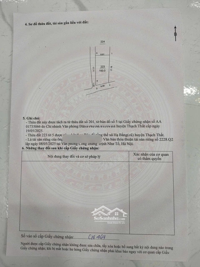 Em cần bán ngay để lấy tiền trả nợ trước Tết Vị trí: Xã Hạ Bằng, huyện Thạch Thất, Hà Nội Diện tích: 150m Pháp lý full thổ cư 100%, sổ đỏ chính chủ Mặt tiền 8m rộng đẹp Khu dân cư đông đúc, an ninh tốt Nằm trên trục liên xã, giao thông thuận tiện lắm ạ Phù hợp xây nhà ở, nhà vườn hoặc đầu tư sinh lời Cách Đại học Quốc Gia,khu công nghệ cao,Cổng trường FPT chỉ 5 phút di chuyểnĐặc điểm nổi bậtDiện tích :150m2Giá :4,5 tỷ