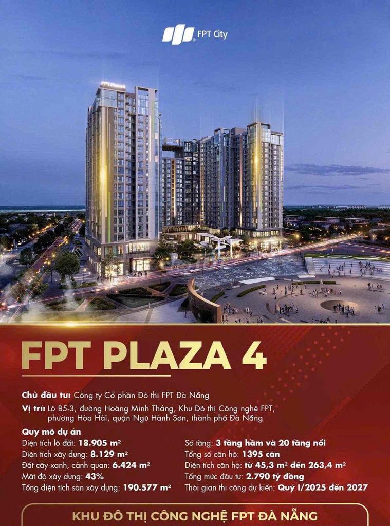 🔥 FPT PLAZA 4 CHÍNH THỨC RA MẮT – Tổ hợp căn hộ cao cấp giá từ 2.1x tỷ 🚀 Tiếp nối thành công của FPT Plaza 3, FPT Plaza 4 – dự án được mong chờ nhất tại FPT City – đã chính thức trình làng. 📍 Vị trí đắc địa trên trục đường Võ Quí Huân với 4 mặt thoáng hiếm có. ________________________________________ ✨ THÔNG TIN TỔNG QUAN DỰ ÁN • Diện tích lô đất: 18,905 m² • Mật độ xây dựng: chỉ 43% – đảm bảo không gian sống thoáng rộng • Quy mô: 3 tầng hầm, 20 tầng nổi – 1.395 căn hộ • Thời gian bàn giao dự kiến: Q1/2025 – Q4/2027 ________________________________________ 🌿 HỆ TIỆN ÍCH NỘI KHU “ĐỈNH CHÓP” • Công viên nội khu 5.400 m² – không gian xanh rộng lớn • Tầng 17: Vườn thượng uyển • Tầng 20: Hồ bơi tầng thượng & cầu ngắm cảnh • 26 thang máy (22 thang cư dân – 4 thang PCCC) • 808 chỗ đỗ ô tô – vượt trội so với các dự án cùng phân khúc ________________________________________ 👉 Đặc biệt, FPT Plaza 3 đã ghi nhận mức tăng trưởng giá trị đáng chú ý chỉ trong 1 năm. 📞 Liên hệ ngay *** để nhận thông tin chi tiết và bảng giá mới nhất của dự án.