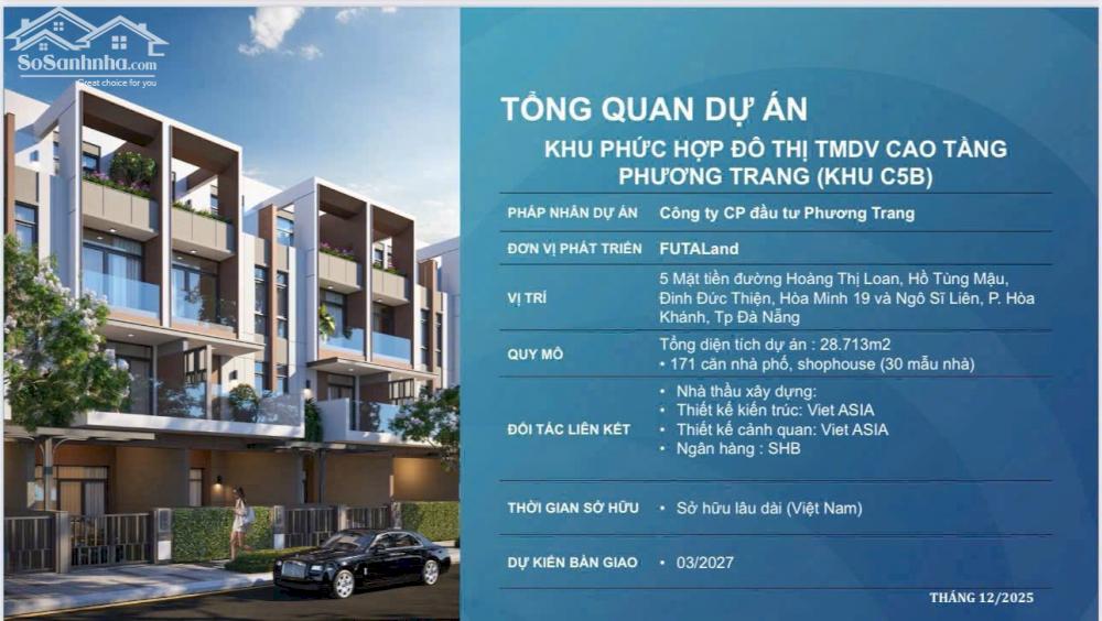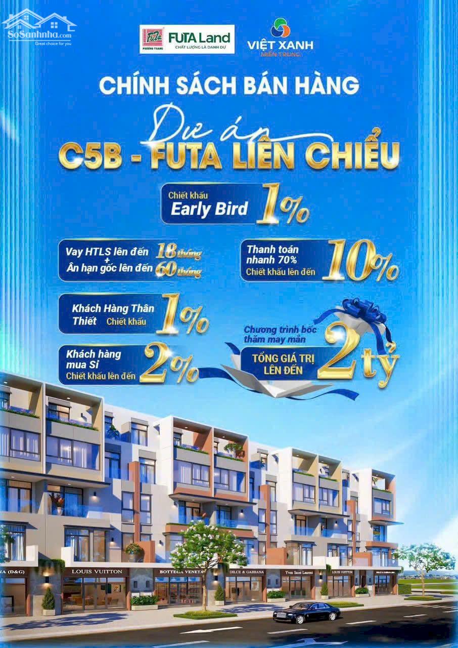 NHÀ PHỐ C5B – LÕI TRUNG TÂM LIÊN CHIỂU Tọa lạc trên hai trục đường huyết mạch Hoàng Thị Loan – Hồ Tùng Mậu, nhà phố C5B FUTA LAND sở hữu vị trí trung tâm hiếm có tại quận Liên Chiểu – khu vực đang được đầu tư đồng bộ về hạ tầng và quy hoạch đô thị. Từ dự án, cư dân dễ dàng di chuyển ra biển Nguyễn Tất Thành, tận hưởng không khí biển trong lành mỗi ngày. Kết nối nhanh trung tâm hành chính Liên Chiểu, khu công nghiệp, cảng biển và các trục giao thông lớn phía Tây Bắc Đà Nẵng. Vị trí vừa thuận tiện sinh sống, vừa giàu tiềm năng gia tăng giá trị theo thời gian. Giá từ 8 tỷ/căn Hỗ trợ ngân hàng 0% lãi suất 18 tháng Ân hạn nợ gốc lên đến 5 năm Chiết khấu tối đa 12% giai đoạn đầu