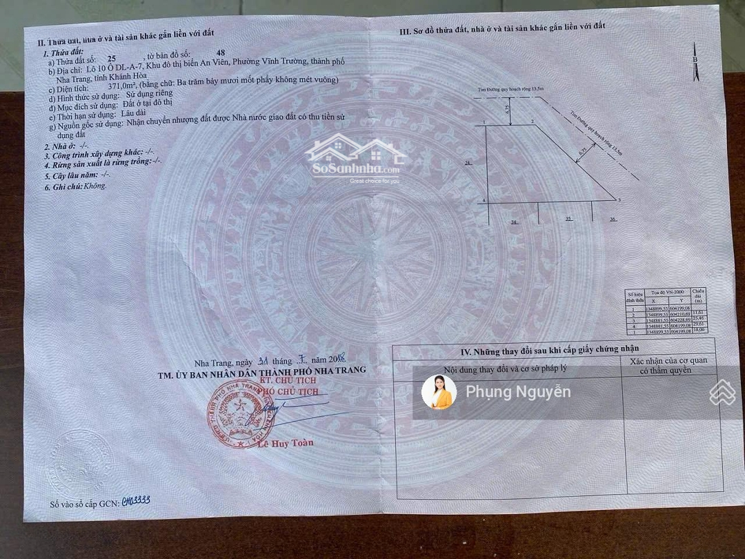 Cuối năm lãi suất NH tăng cao, chủ NgỘP cần bán ra lô đất này để xử lý NH. - Diện tích: 371m2 - 2 mặt tiền chính Bắc - Đông Bắc. - Cách bãi tắm 250m. - Sổ đỏ lâu dài. - Giá mua vào anh chị có lời ngay: 82tr/m2 có bớt lộc. - Sang đầu tháng 3 dự án Vinhomes Pearl Bay Nha Trang (dự án sát cạnh của Vin) ra hàng thì vị trí này trên 120tr/m2. (hiện các lô đối lưng đã giao dịch 115 - 120tr/m2 từ tháng 9/2025). * Anh chị quan tâm liên hệ: - em Phụng Nguyễn Tuệ Minh. Xin chân thành cảm ơn!!!Đặc điểm nổi bậtDiện tích :371m2Mặt tiền :12mGiá :30,42 tỷĐường vào :13.5m