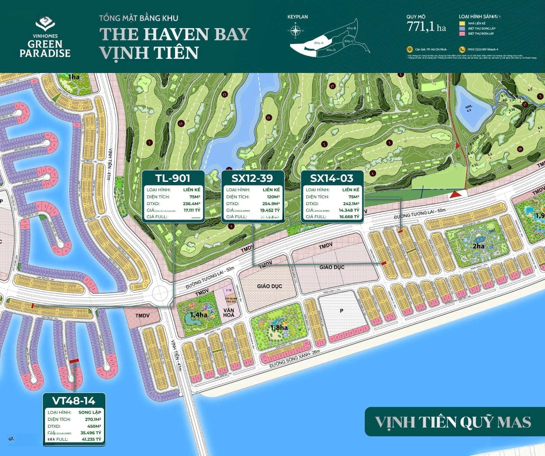 Phòng Kinh Doanh xin gửi Anh Chị quỹ hàng đẹp nhất vừa ra lò phân khu A - Vịnh Tiên ở Vinhomes Green Paradise Cần Giờ! * Liền kề Vịnh Tiên - Quỹ Hàng Masterise Homes - Vị Trí Đẹp Nhất (Sát Biển - Cạnh Sân Golf) - Chiết Khấu Lớn Nhất Có Thể Nhận Ngay. Liên hệ phụ trách kinh doanh hotline : Hỗ Trợ Đưa Đón AC Đi Xem Trực Tiếp) Một Số Căn Vị Trí Đẹp - Áp Góc - Giá Hời: Sóng xanh 14 - 2x 75m² giá chỉ 13,x tỷ. Hướng đông bắc. Sóng xanh 13 - 5x 75m² hướng tây nam giá chỉ 14,x tỷ. Sóng xanh 23 - 8x 75m² hướng nam giá chỉ 15,x tỷ. Sóng xanh 23 - 6x 75m² hướng nam đổi diện công viên giá chỉ 17,xx tỷ. * Dự kiến có 2 chính sách thanh toán nhận nhà sau 1 năm và chính sách giãn xây 3 năm. * Vốn ban đầu từ 30% đối với chính sách nhận nhà sau 1 năm. * Vốn ban đầu 15% đến 30% tiền đất đối với chính sách giãn xây. * Hỗ trợ lãi suất vay vốn ngân hàng 0% dự kiến 24 tháng kể từ ngày giải ngân đầu tiên. Thanh Toán Đến 4 Năm. * Chính thức nhận booking cọc thiện chí cho đợt 1 mở bán! Mr Thái: Quỹ căn đẹp + rẻ + hiếm. Qũy căn mới nhất cập nhật liên tục. * Quần thể tiện ích đẳng cấp quốc tế: Sân golf 27 lỗ chuẩn quốc tế. Vinpearl Safari vườn thú hoang dã. Vincom Mega Mall trung tâm mua sắm sầm uất. Phố đi bộ & chợ đêm sôi động. Hệ thống Vinschool & Bệnh viện Vinmec. Tòa tháp biểu tượng 108 tầng. Nhà hát lớn nhất Đông Nam Á. Dự án ứng dụng mô hình ESG tiên tiến: Năng lượng tái tạo, vật liệu xanh & đô thị thông minh. Cơ hội hiếm có để sở hữu tài sản tại đại đô thị biển đẳng cấp nhất Việt Nam!Đặc điểm nổi bậtDiện tích :75m2Mặt tiền :5mGiá :13 tỷSố tầng :4 tầngĐường vào :14m