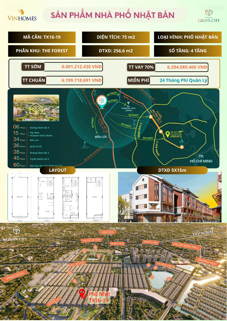 *Bán nhanh cắt lỗ 100 triệu. Nhà phố Nhật Bản Vinhomes Green City*. Chưa ký HĐMB, sang tên trực tiếp chính chủ. Không thuế phí. TX16-19: Tuyệt phẩm nhà phố thương mại Nhật Bản tại Vinhomes Green City!!! - Diện tích đất: 75 m2 - Tổng diện tích xây dựng: 256,6 m2 1. TTS: 6.001 tỷ (Full VAT và Phí Bảo trì) 2. Giá full : 6.394 tỷ ( TT tiến độ chuẩn) 3. Vốn tự có 15%: 600 triệu. Ân hạn gốc lãi 2 năm. Không phí trả nợ trước hạn. Những Ưu đãi khủng: Tặng gói phí quản lý Nhà ở 24 tháng Tặng voucher VinWonder Vinmec VinPassport trị giá đến 235 triệu Chiết khấu Vinclub lên đến 1,3% Sổ đỏ lâu dài nhận nhà 2028 Cơ hội sở hữu ngay căn nhà phố phong cách Nhật Bản tại đại đô thị Vinhomes Green City không gian sống chuẩn tinh tế, an yên, đẳng cấp giữa lòng đô thị xanh. Thông tin nổi bật: - Thiết kế Nhật Bản hiện đại, tone màu tối giản sang trọng. - Bố trí không gian tối ưu, ánh sáng tự nhiên tràn ngập. - Nằm trong khu phố Nhật sầm uất tiềm năng tăng giá mạnh. - Hưởng trọn tiện ích Vinhomes: TTTM, trường học, công viên, hồ cảnh quan. Giá bán cực tốt cắt lỗ 100 triệu. Phù hợp cho khách mua ở hoặc đầu tư giữ tài sản giai đoạn này. Lợi thế đầu tư: Thanh khoản cao, nhu cầu thuê lớn. Khu phố Nhật độc quyền biên độ tăng giá vượt trội. Hưởng lợi từ toàn bộ đại đô thị Green City đang tăng tốc hoàn thiện. Liên hệ ngay: Cơ hội chỉ dành cho người đến trước thiện chí bán nhanh!Đặc điểm nổi bậtDiện tích :75m2Mặt tiền :20mGiá :6 tỷSố tầng :4 tầngPhòng ngủ :3 phòngPhòng tắm :3 phòngĐường vào :20m
