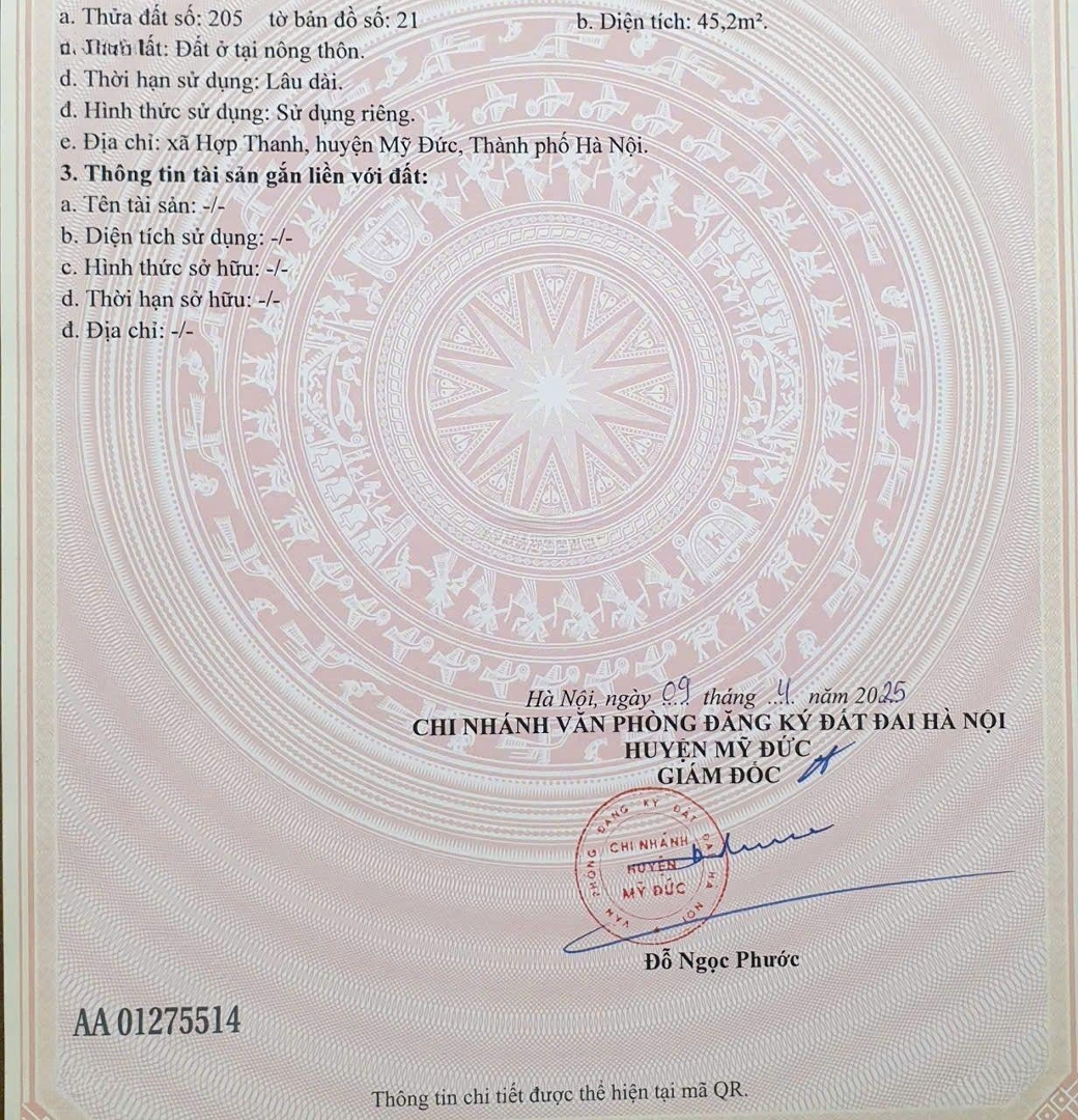 PHÂN KHÚC NHỎ RẺ NHẤT MỸ ĐỨC CHỈ HƠN 600TR CÓ LÔ ĐẤT ĐẸP TẠI HỢP THANH, MỸ ĐỨC, HÀ NỘI Diện tích:45m full thổ cư, Vị trí siêu thuận lợi: Đường trước đất rộng 4m, ô tô vào thoải mái Dân cư đông đúc, tiện ích đầy đủ, an ninh tốt Ngay gần đường mòn Hồ Chí Minh, giao thông thuận tiện đi lại Giá chỉ hơn 600 triệu Cơ hội hiếm có cho nhà đầu tư và an cư lâu dài! Liên hệ Zalo:0962410962Đặc điểm nổi bậtDiện tích :45.2m2Mặt tiền :4mGiá :670 triệuĐường vào :3m