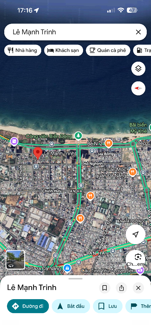 Bán khách sạn mặt tiền Lê Mạnh Trinh, Sơn Trà | cách biển 300m. Diện tích: 100m2 (5m x 20m). Kết cấu: 6 tầng 11 phòng, có thang máy, PCCC đầy đủ. Nội thất: Full nội thất cao cấp khai thác ngay. Đường: 7,5m vỉa hè 4m, khu phố du lịch sầm uất. Dòng tiền 40 triệu/tháng. Vị trí đắc địa: Gần trục Võ Nguyên Giáp. Đi bộ ra bãi tắm Phạm Văn Đồng. Khu đô thị biển đẹp bậc nhất Đà Nẵng, tập trung nhà hàng khách sạn resort. Phù hợp đầu tư khai thác lưu trú giữ tài sản lâu dài khu biển. Giá bán: 21.2 tỷ. Liên hệ Mr Quang Tây.Đặc điểm nổi bậtDiện tích :100m2Mặt tiền :5mGiá :21,2 tỷSố tầng :6 tầngPhòng ngủ :13 phòngPhòng tắm :13 phòngĐường vào :7.5m