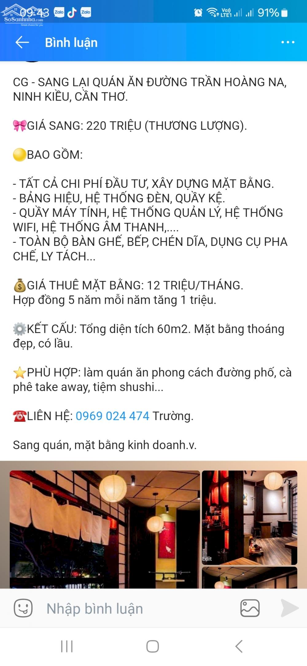 CG - SANG LẠI QUÁN ĂN ĐƯỜNG TRẦN HOÀNG NA, NINH KIỀU, CẦN THƠ. GIÁ SANG: 220 TRIỆU (THƯƠNG LƯỢNG). BAO GỒM: - TẤT CẢ CHI PHÍ ĐẦU TƯ, XÂY DỰNG MẶT BẰNG. - BẢNG HIỆU, HỆ THỐNG ĐÈN, QUẦY KỆ. - QUẦY MÁY TÍNH, HỆ THỐNG QUẢN LÝ, HỆ THỐNG WIFI, HỆ THỐNG ÂM THANH,.... - TOÀN BỘ BÀN GHẾ, BẾP, CHÉN DĨA, DỤNG CỤ PHA CHẾ, LY TÁCH... GIÁ THUÊ MẶT BẰNG: 12 TRIỆU/THÁNG. Hợp đồng 5 năm mỗi năm tăng 1 triệu. ️KẾT CẤU: Tổng diện tích 60m2. Mặt bằng thoáng đẹp, có lầu. ⭐PHÙ HỢP: làm quán ăn phong cách đường phố, cà phê take away, tiệm shushi... ️LIÊN HỆ: 0969 024 474 Trường. Sang quán, mặt bằng kinh doanh.v.