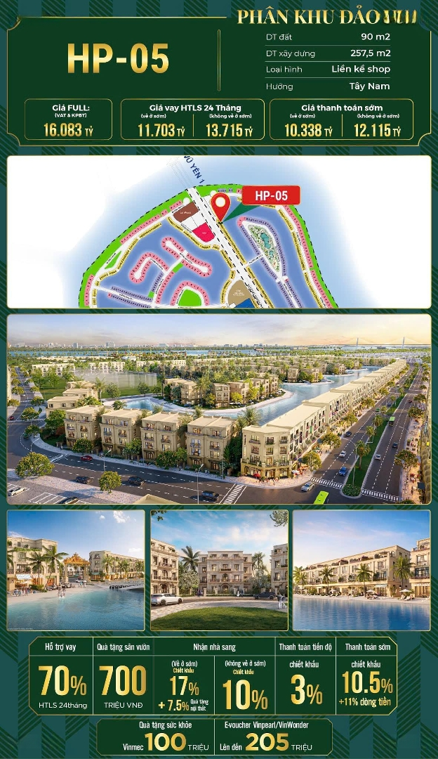Shophouse HP-05 Diện tích 90m2*4 tầng, Biển xanh sau nhà Mặt tiền trục đường chính dự án 51m. Nằm ngay cửa ngõ dự án, thuận tiện đi lại về trung tâm thành phố & sang Thuỷ Nguyên Giá TTS: 10,33 tỷ Lh/zalo: E Nguyễn Trang VinhomesĐặc điểm nổi bậtDiện tích :90m2Giá :10,34 tỷ