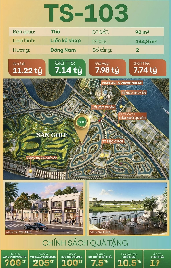 Quỹ hàng ngoại giao tốt nhất TS-103 SHOPHOUSE 2 TẦNG VIEW GOLF GIÁ TỐT HIẾM TẠI VŨ YÊN Đtlh DT Đất: 90m | DT Xây dựng: 144,8m | 2 tầng Liền kề shop bàn giao thô | Hướng Đông Nam Trước nhà kinh doanh sau nhà view sân golf & hồ nước Gần lối vào dự án Vinpearl VinWonders bến du thuyền Giá cực tốt: TTS chỉ hơn 7 tỷ Quà & ưu đãi khủng: quà sân vườn 700tr | VOS ck 17% | quà nội thất ck 7.5% | Vinpearl 205tr | Vinmec 100tr Căn đẹp giá hiếm, chốt nhanh kẻo hết! TỐT HIẾM TẠI VŨ YÊN DT Đất: 90m | DT Xây dựng: 144,8m | 2 tầng Liền kề shop bàn giao thô | Hướng Đông Nam Trước nhà kinh doanh sau nhà view sân golf & hồ nước Gần lối vào dự án Vinpearl VinWonders bến du thuyền Giá cực tốt: TTS chỉ hơn 7 tỷ Quà & ưu đãi khủng: quà sân vườn 700tr | VOS ck 17% | quà nội thất ck 7.5% | Vinpearl 205tr | Vinmec 100tr Căn đẹp giá hiếm, chốt nhanh kẻo hết!Đặc điểm nổi bậtDiện tích :90m2Mặt tiền :5mGiá :7 tỷĐường vào :13m