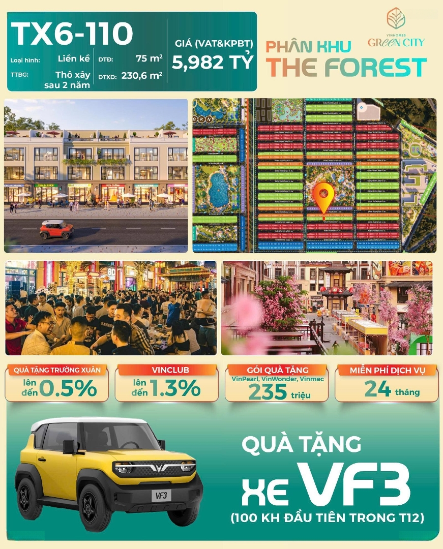 Vinhomes Hậu Nghĩa - TX6 - 110 (75m2). Vốn 584tr - tặng xe VF3. Hàng hot - sau lưng phố Trung Hoa. Thông số nổi bật: Loại hình: Nhà phố Liền kề. Diện tích đất: 75m². Hướng: Đông Nam. Giá full: 5,982 tỷ. TTS: Chiết khấu 12,5%. Những ưu đãi khủng: Tặng gói phí quản lý nhà ở 24 tháng. Tặng voucher VinWonder Vinmec VinPassport trị giá đến 235 triệu. Chiết khấu Vinclub lên đến 1,3%. Quà tặng Trường Xuân: CK thêm 0,5%. Tặng xe VF3 (kèm pin) cho 30 khách hàng đầu tiên. Sổ đỏ lâu dài nhận nhà 2028. Hotline/zalo: Mr. Ty). Đại lý F1 Vinhomes Green City. Chuyên phân phối BĐS Vinhomes Toàn Quốc.Đặc điểm nổi bậtDiện tích :75m2Mặt tiền :5mGiá :5,98 tỷĐường vào :15m